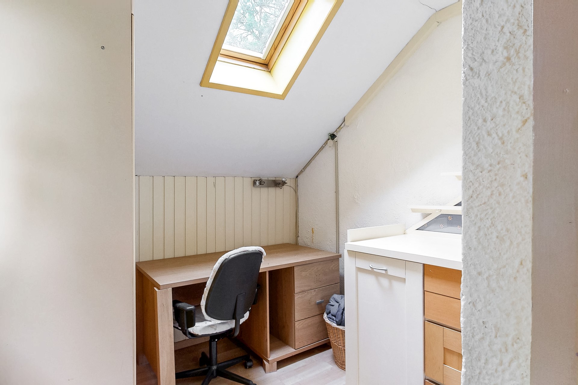 Allereerst bereiken we de overloop; deze is heerlijk licht dankzij het Velux-dakvenster. De aanwezige kasten mogen achterblijven en bieden praktische opbergruimten. Het trapgat is volledig afsluitbaar met een luik, zodat de warmte van beneden niet verloren gaat naar boven.