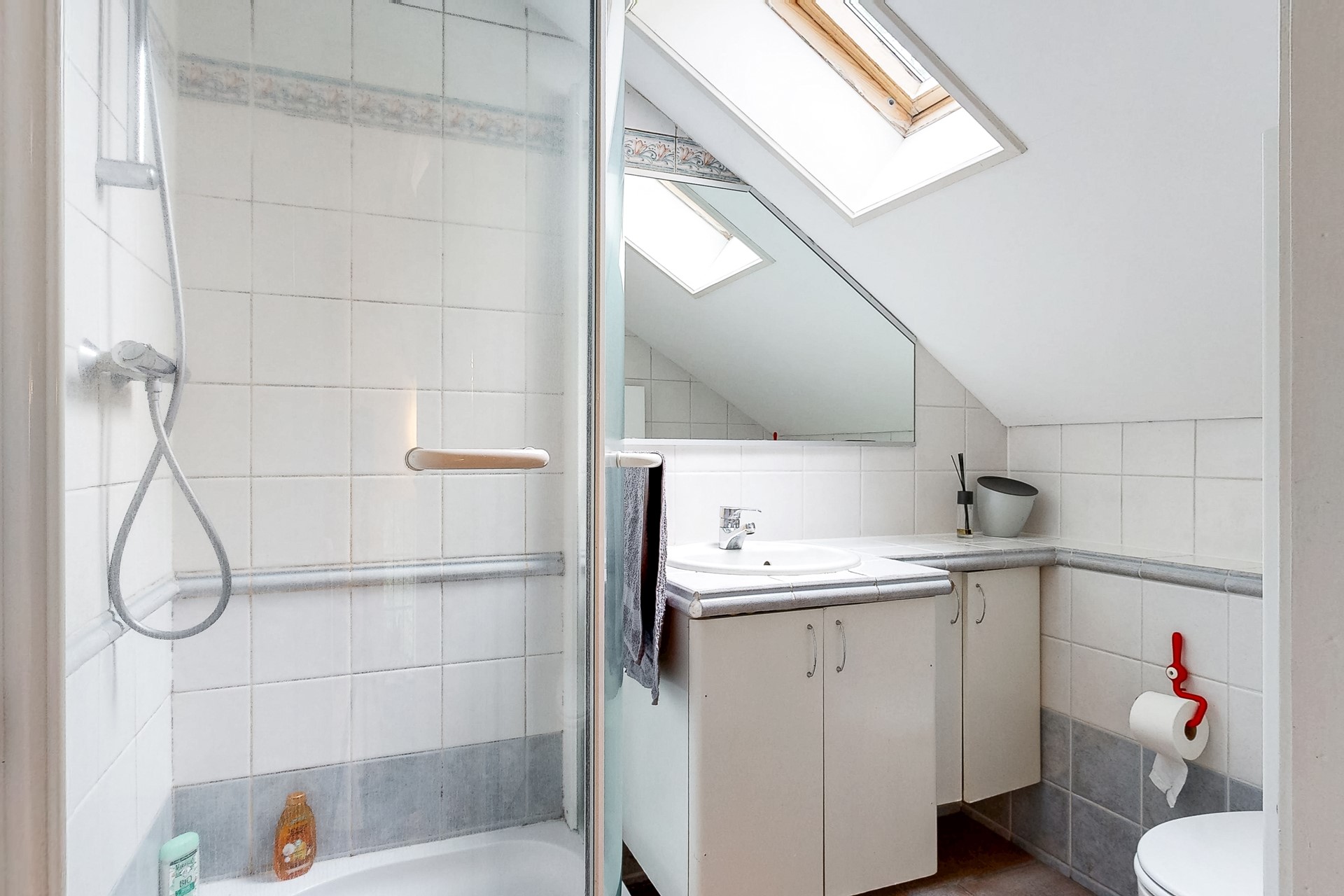 De badkamer, eveneens op dijkniveau, is slim ingedeeld met een halfronde douchecabine, een wastafelmeubel en een wandcloset. Het sanitair is gedateerd, maar qua indeling is dit een prachtig uitgangspunt om wat nieuws te creëren. De designradiator is in 2022 nieuw geïnstalleerd en zorgt in combinatie met de elektrische afzuiging en het Velux-venster voor een aangename temperatuur en een frisse atmosfeer.