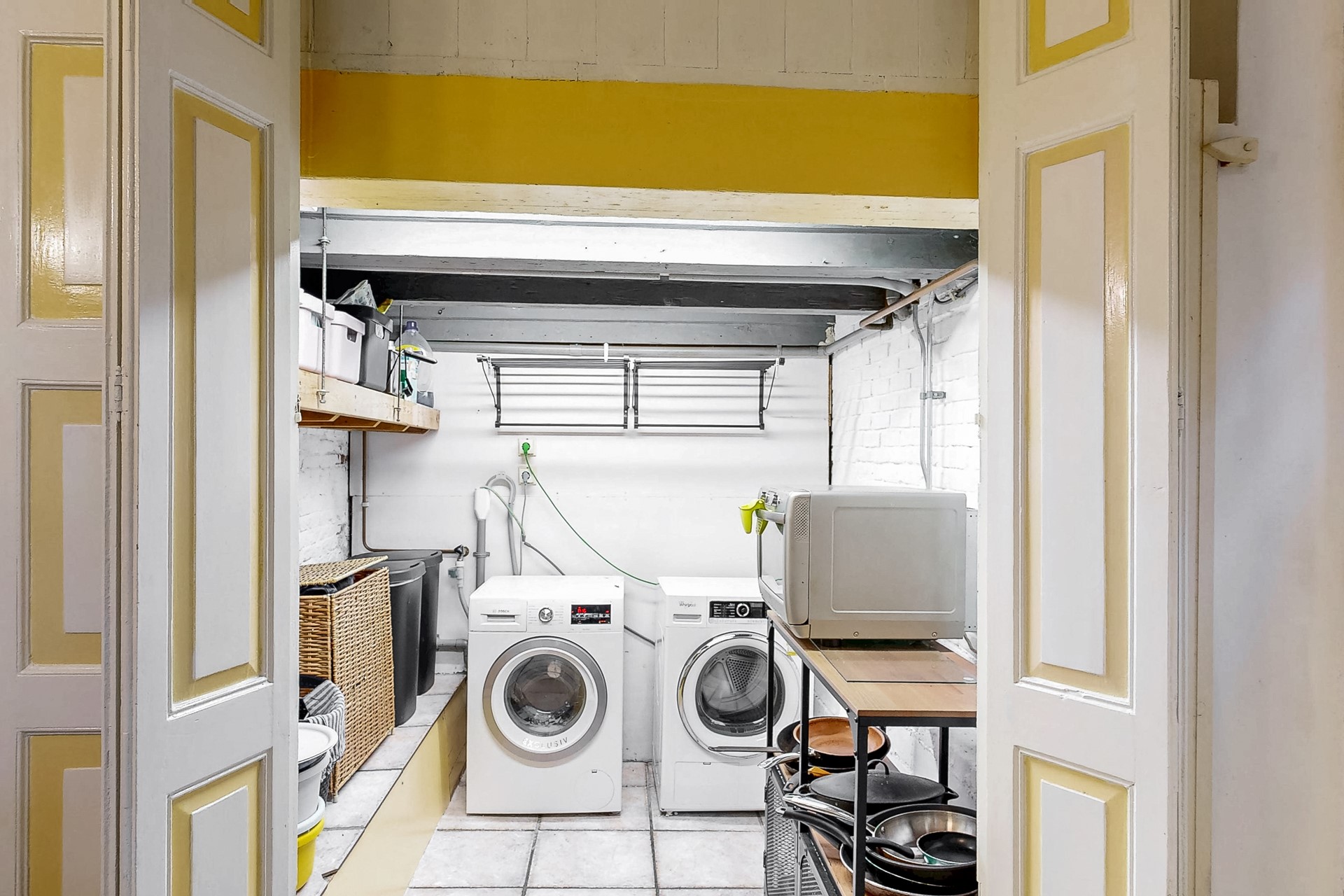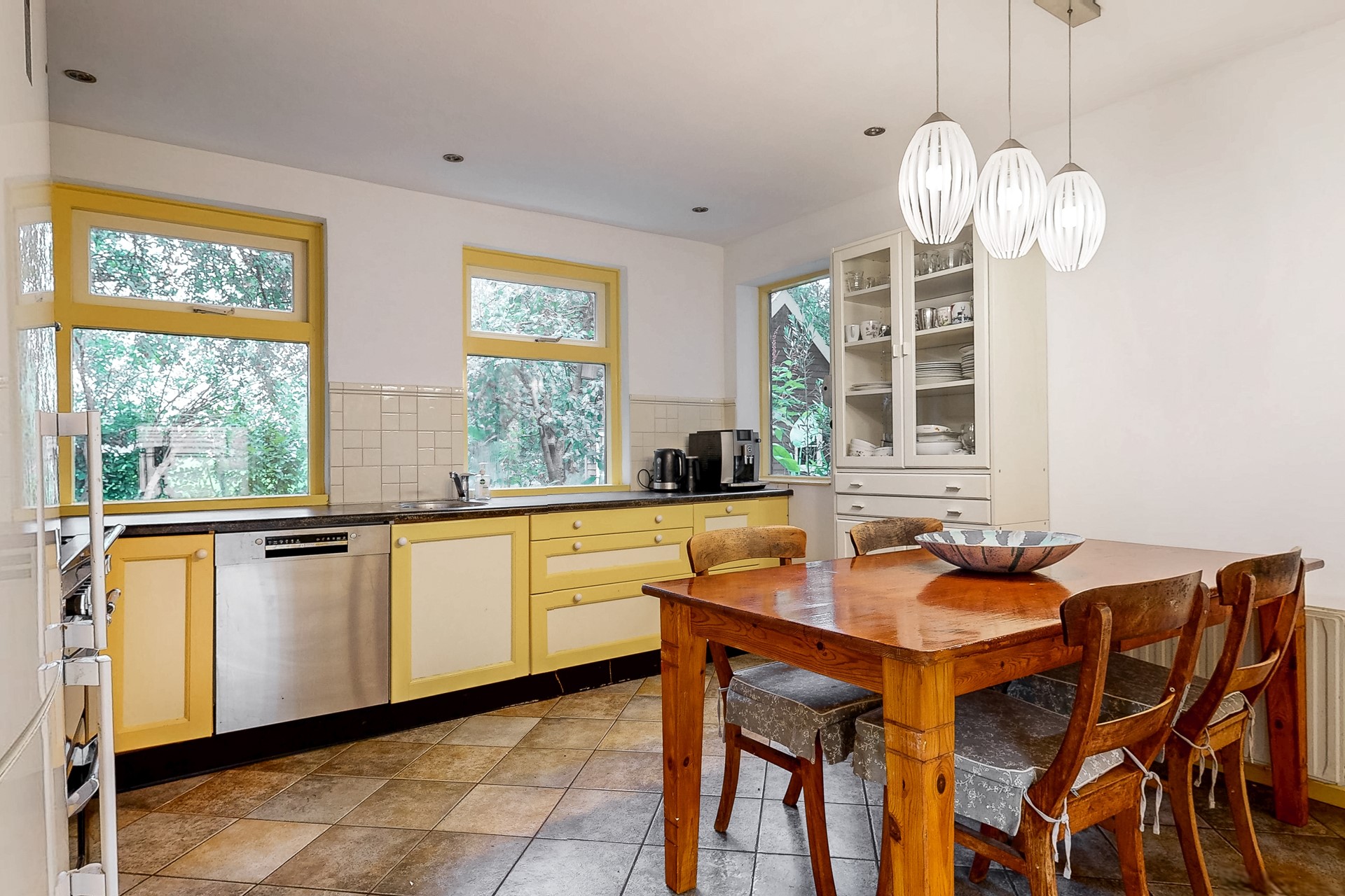 De royale woonkeuken staat in halfopen verbinding met de woonkamer en biedt ruimte om een royale eettafel te plaatsen. Het is de plek voor gezellige conversaties en lange diners met familie of vrienden. De L-vormige keukenopstelling is uitgerust met een spoelbak, vaatwasmachine (2023), koelkast en diverse laden en kastruimten. Het fornuis gaat mee. De drie ramen boven het werkblad bieden een geweldig uitzicht op de tuin - en als je de beplanting snoeit ook richting de hierachter gelegen weilanden. De bijzonder fraaie kastenwand is uitgevoerd met originele deuren uit de oude pastorie van Beesd. Achter deze deuren gaat enerzijds een diepe voorraadkast en anderzijds een royale wasruimte schuil. De deelbare deur in de zijgevel is naar het originele ontwerp nagemaakt en biedt toegang tot de tuin aan de linkerzijde van het huis.