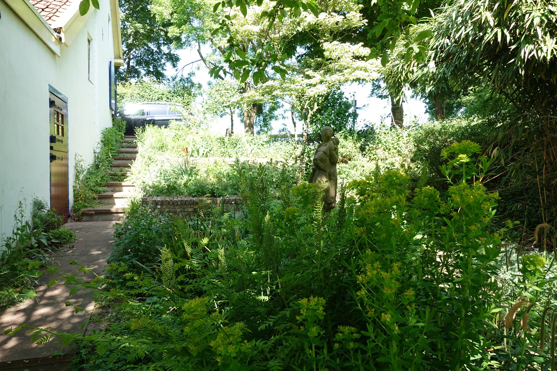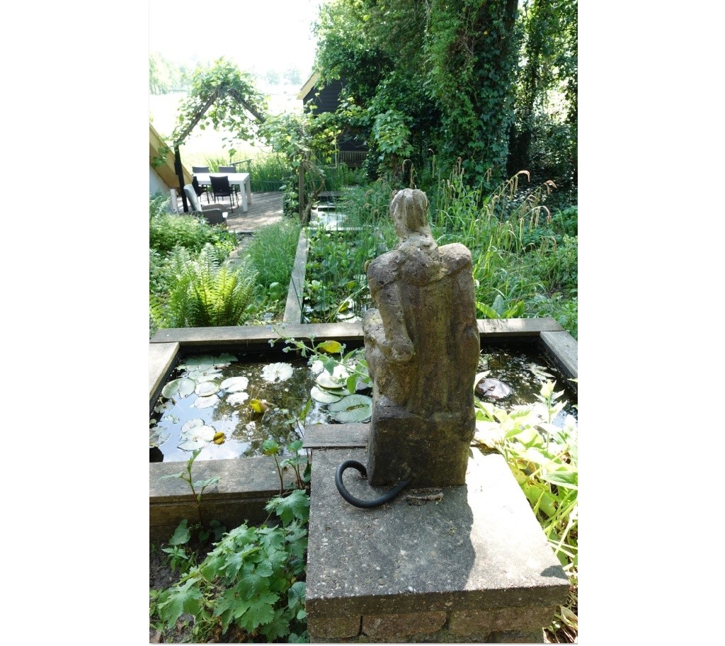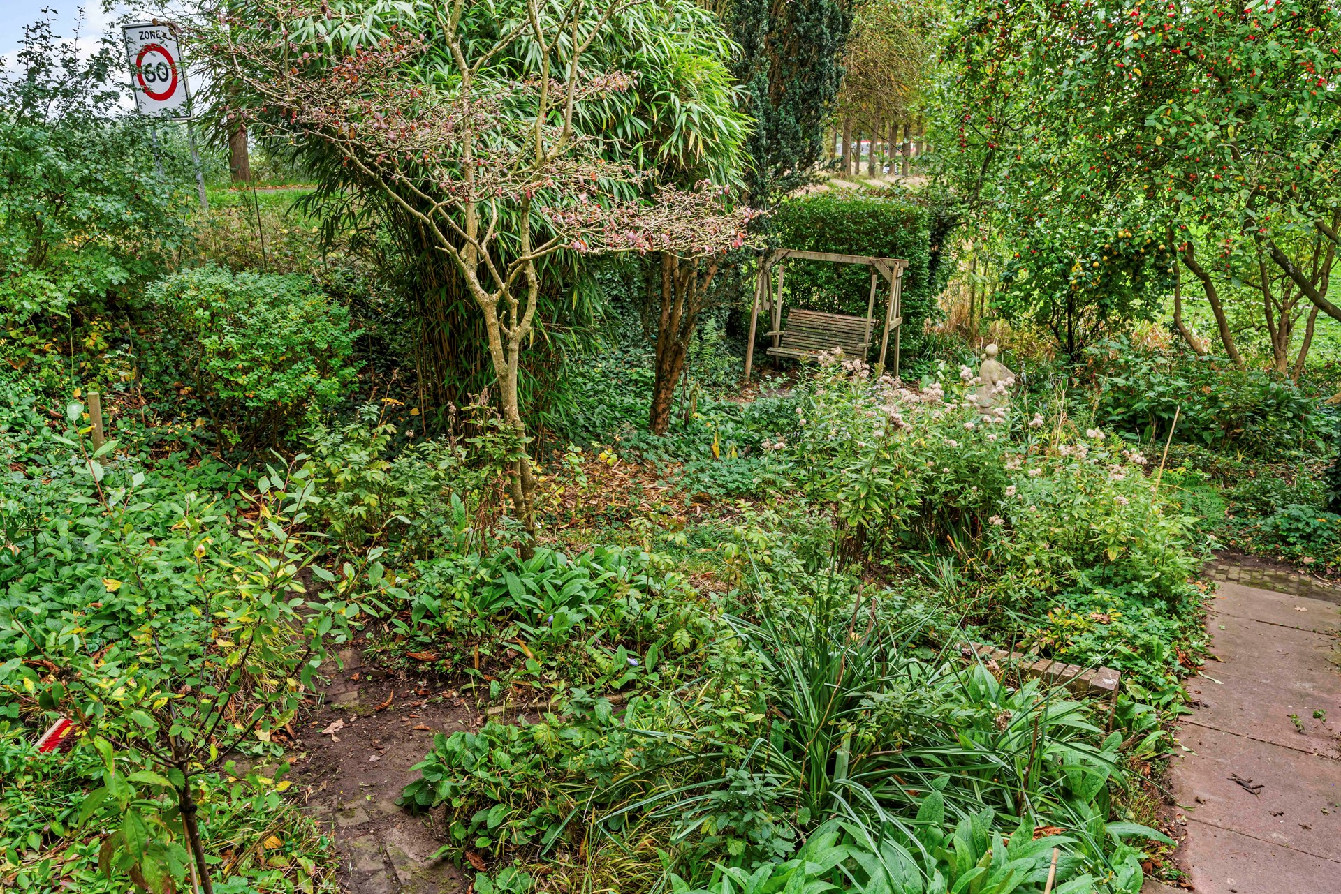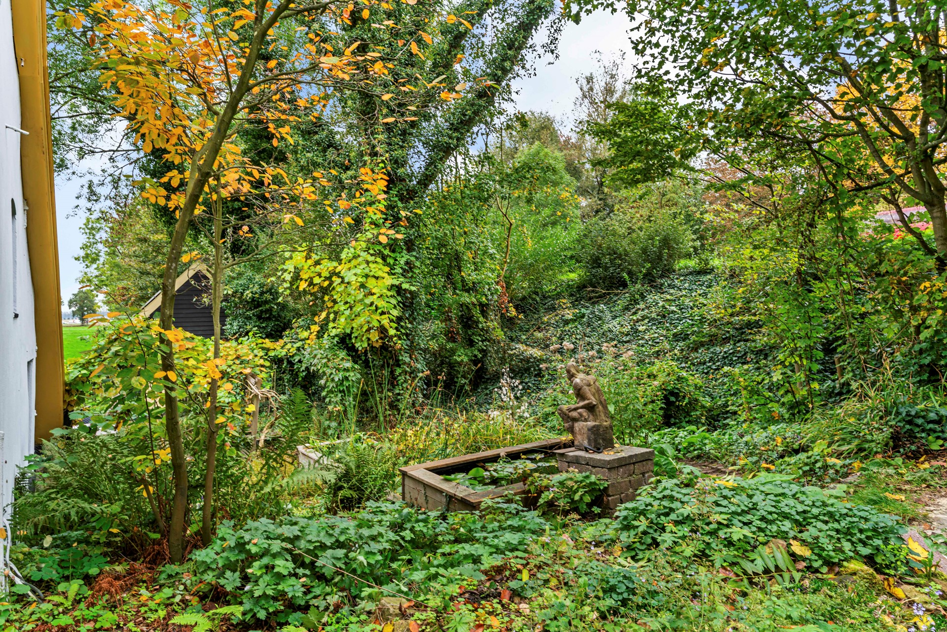 De tuin van Polderdijk 32 voelt als een zorgvuldig ontworpen buitenbeleving, waar ontspanning en natuur elkaar ontmoeten. We beschrijven de achtertuin vanaf de openslaande deuren van de woonkamer. Het hier aanwezige vlonderterras wordt opgesierd door een pergola begroeid met druiven. Vanaf hier geniet je van een prachtig uitzicht op je tuin en de hierachter gelegen weilanden. De tuin is ingericht met een weelderige beplanting, waar het hele jaar door wel wat bloeiends te vinden is. Ook een eigen fruitoogst ligt binnen handbereik; er is een perenboom, appelboom, sierappelboom, twee kweeperenbomen en een druivenstruik. Let ook op de indrukwekkend grote essen met hun prachtige silhouetten. Eyecatcher is de vijverpartij in cascadevorm in de zijtuin, geïnspireerd op de tuinen van het Alhambra in Spanje.