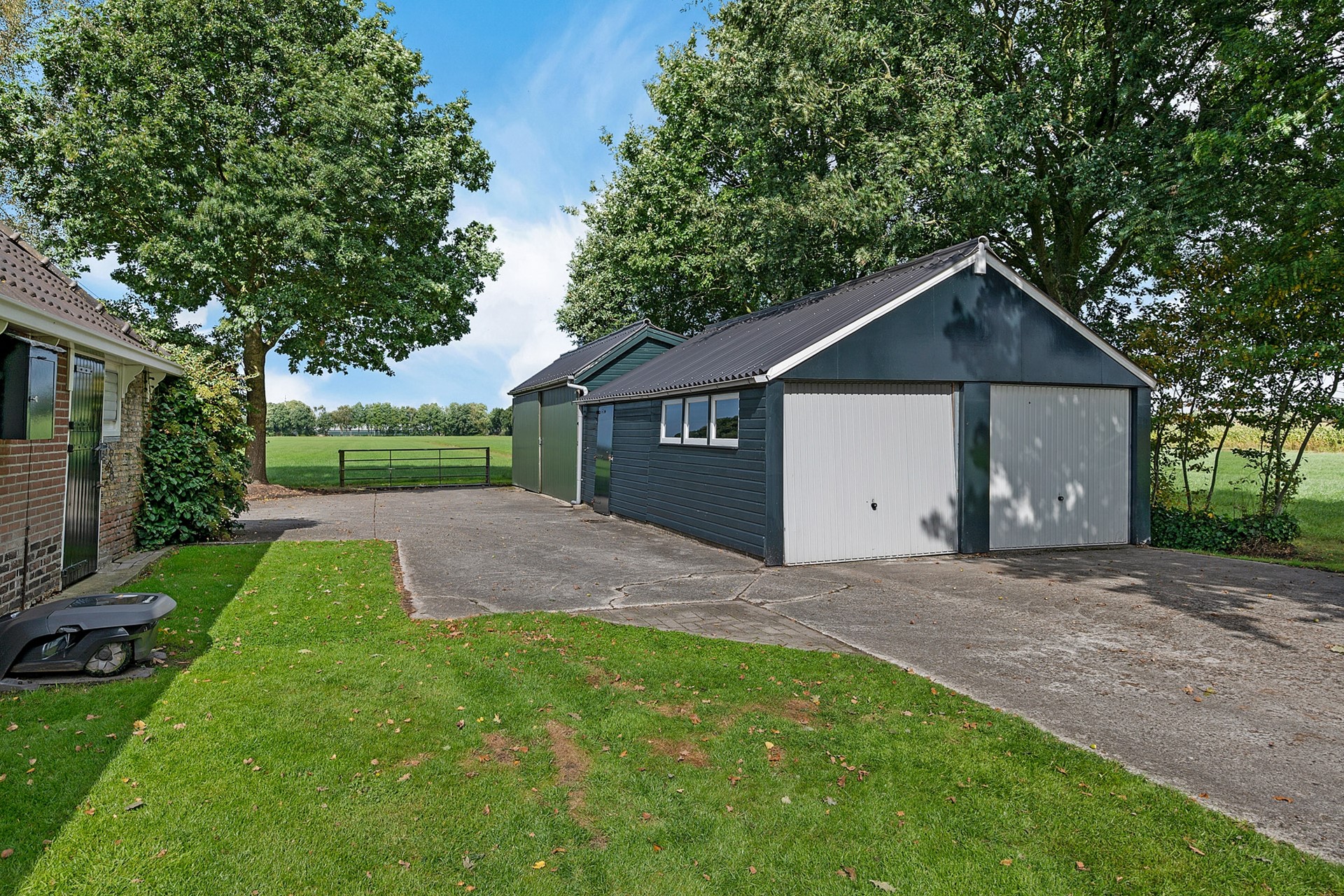 Deze dubbele garage is opgetrokken uit hout en meet circa 5,19 bij 7,91 meter. Het dak is bedekt met golfplaten en de vloer is van beton.