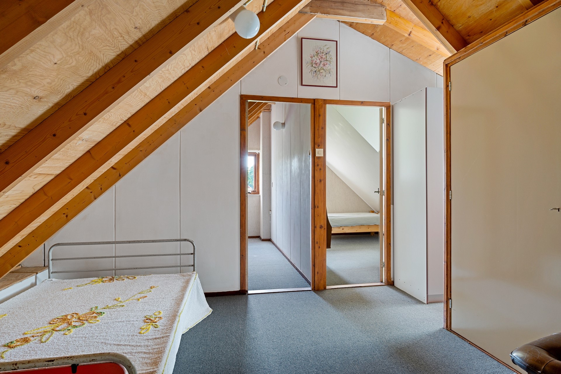 Overloop 3 eenvoudige slaapkamers (ca 4,9, 5,8 en 6,8 m2) en een overige ruimte met overloop.