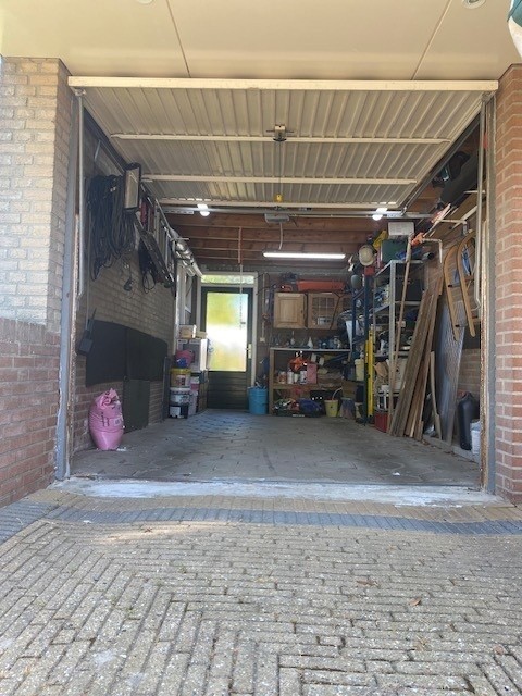 Aangebouwde garage, voorzien van tegelvloer en gebouwd van halfsteens gemetselde muren, betonvloeren en een elektrisch bedienbare overheaddeur.